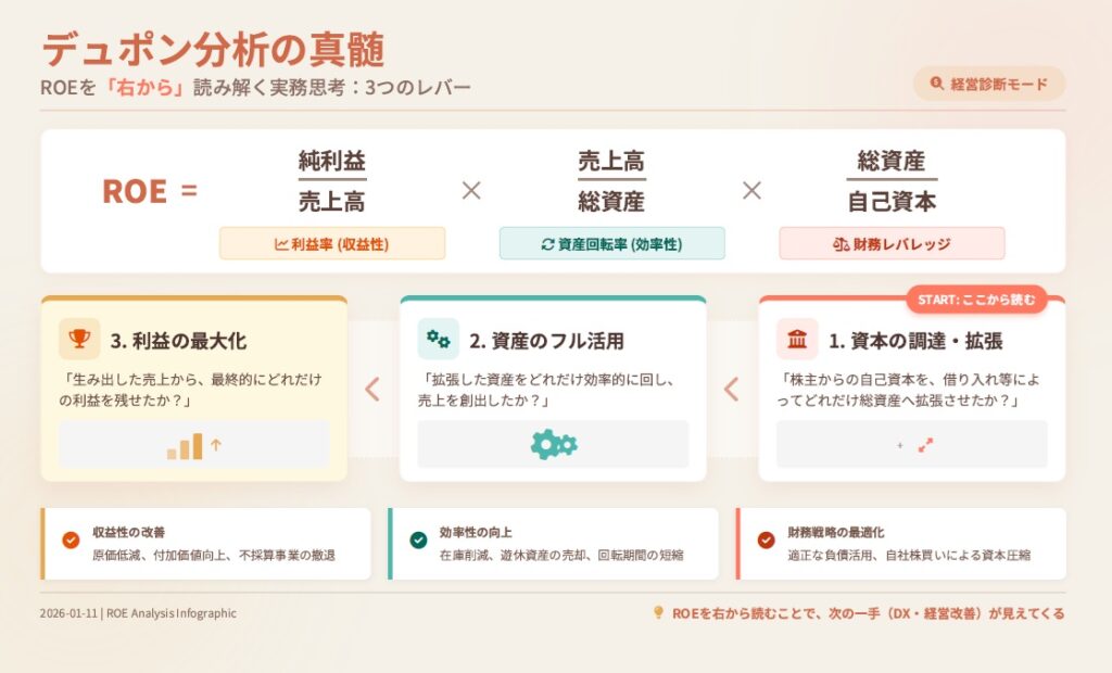 💡この記事を書くにあたり、複数の文献を調査しましたが、ROEの分解式(デュポン分析)を「右から読む」視点で解説しているものは驚くほど少ないことに気づきました。