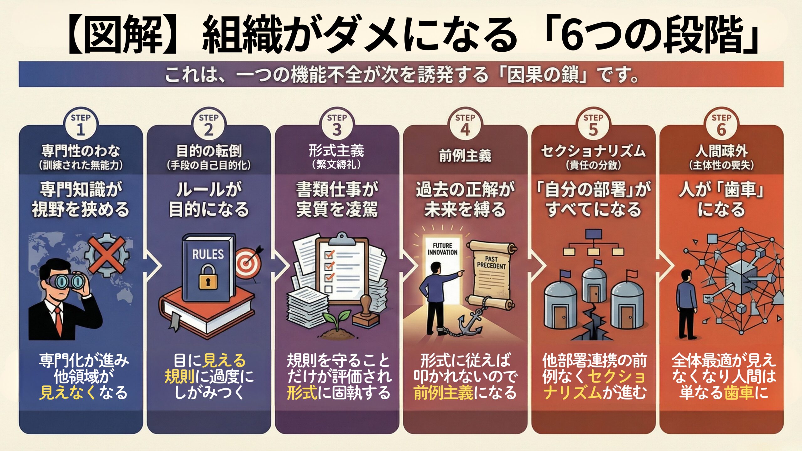 | 6 | 組織の帰結 | 人間疎外 あるいは 主体性の喪失 | 規則準拠・手続き実行が進みすぎ、人が判断主体でなくなる |